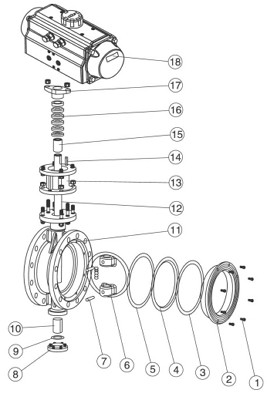 气动法兰调节蝶阀默认配AT型双作用气动执行机构(选配单作用气动执行机构),可配电磁阀换向阀(AC220、DC24V、防爆型)、限位开关(阀位反馈、防爆型)、空气过滤减压阀(气源三联件)