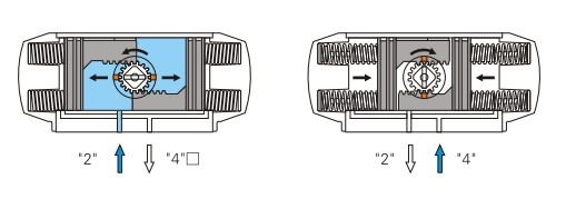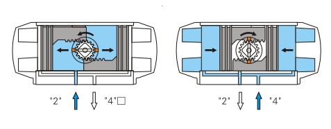 当气源压力从气口(2)进入气缸两活塞之间中腔时,使两活塞分离向气缸两端方向移动,两端气腔的空气通过气口(4)排除, 同时使两活塞齿条同步带动输出轴(齿轮)逆时针方向旋转。反之气源压力从气口(4)进入气缸两端气腔时,使两活塞向 气缸中间方向移动,中间气腔的空气通过气口(2)排除,同时使两活塞齿条同步带动输出轴(齿轮)顺时针方向旋转。 (如果把活塞相对反方向安装,输出轴变为反向旋转,即为双作用反转型)